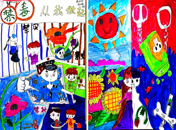 这是来自盛乐村9岁小朋友的原创漫画,第一幅画从“禁买”、“禁吸”、“禁种”的角度,告诉观众该如何拒绝毒品,防止毒品的传播。第二幅画左右两边从色彩到表现形式形成鲜明的对比,告诫我们吸毒会对原本美好的生活带来巨大的痛苦。
