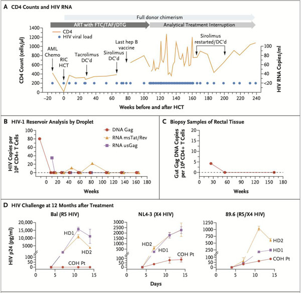 2022年2月15日,加州大学洛杉矶分校和约翰·霍普金斯大学的研究团队在逆转录病毒和机会性感染会议(CROI)上报告了一个艾滋病治疗案例:一名接受脐带血干细胞移植治疗急性髓细胞白血病的女性艾滋病患者,在停止抗逆转录病毒药物治疗后,已经长达14个月没有检测到HIV病毒。该病人被称为“纽约病人”。