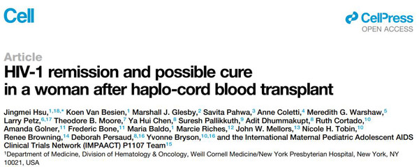 2023年3月16日,威尔康奈尔医学院等机构的研究人员在 Cell 期刊发表了题为:HIV-1 remission and possible cure in a woman after haplo-cord blood transplant 的研究论文【2】。