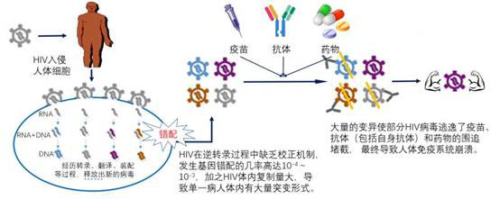 由于HIV复制过程中的大量变异,首先使得体内抗体的进化往往不能跟上病毒的变异速度,最终免疫系统失去抵抗而崩溃[3]。其次,随着高效抗病毒治疗(HAART)的普及,在抗病毒药物和抗体的双重选择压力下,一些因随机突变而产生耐药基因的病毒会重新占领高地,特别是服药依从性差的患者[4]。第三,设计和开发HIV疫苗需要能够产生高效价的中和抗体并有效记忆,而HIV高度变异导致的不同亚型、重组型和独特型以及不同毒株间的巨大差异,使得HIV毒株间的抗原性差异可以达到35%,因此HIV的疫苗研制变得极为困难,时至今日,还没有任何一种疫苗能够产生有效的广谱的保护性。