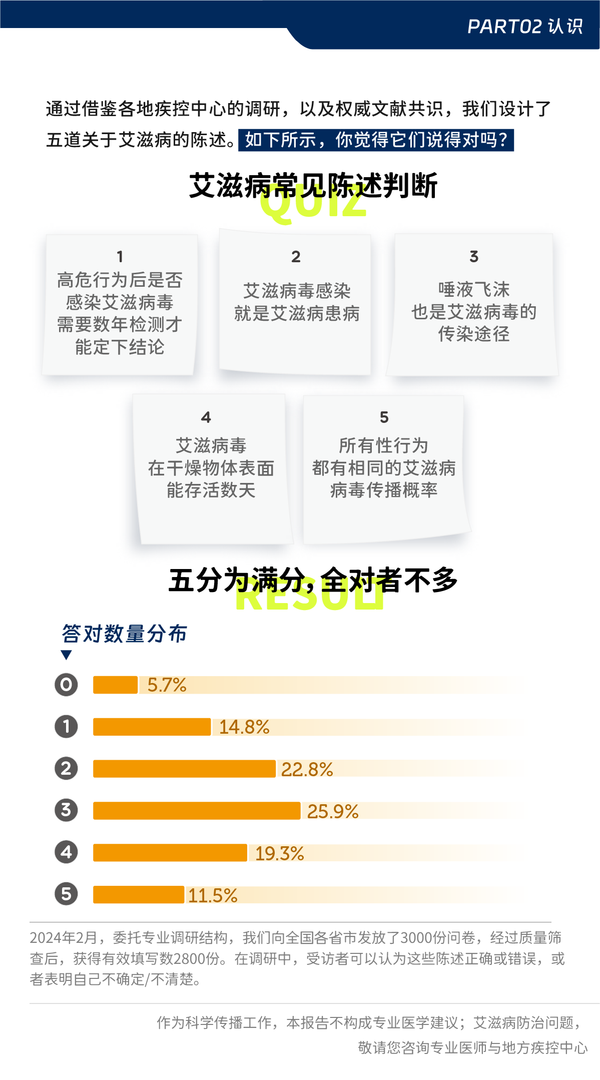 通过借鉴各地疾控中心的调研,以及权威文献共识,我们设计了五道关于艾滋病的陈述。如下所示,你觉得它们说得对吗?