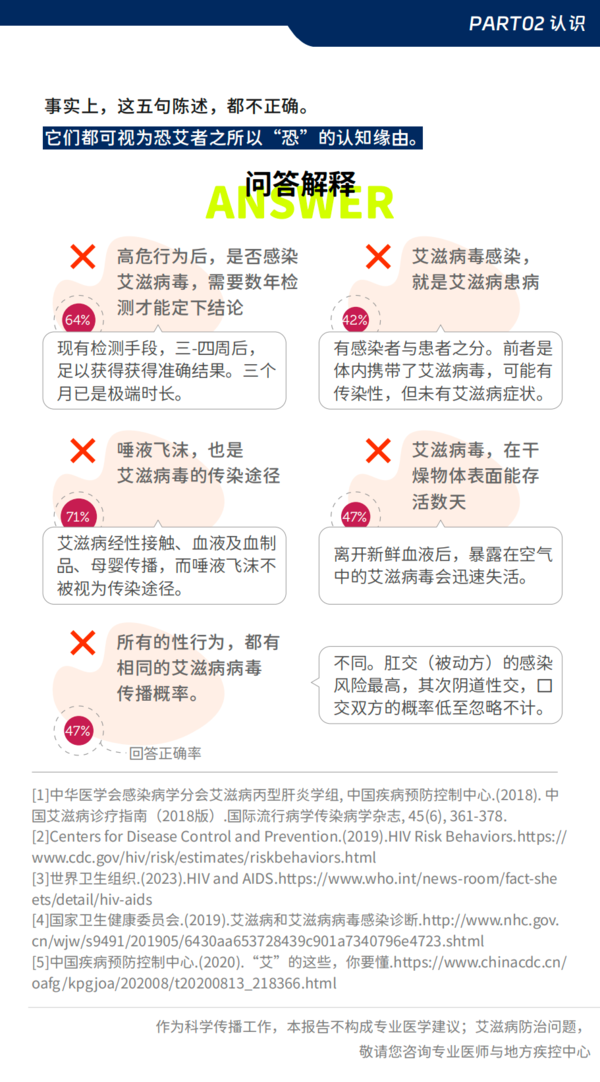 前面提到了感染者与患者之分。事实上,艾滋病毒感染,的确不等于艾滋病患病。前者是体内携带了艾滋病毒,可能具有传染性,但未有艾滋病症状。在坚持服药、控制好病载量的情况下,多年都不会发病,乃至像健康人一样达到预期寿命[6]。仅有42%的人对此有区分。