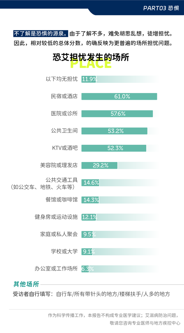 这也不难怪,在公共交通工具(如公交车、地铁、火车等)、餐馆或咖啡馆、健身房或运动设施等场所,也有近15%的受访者,出现了对艾滋病传播的担忧。