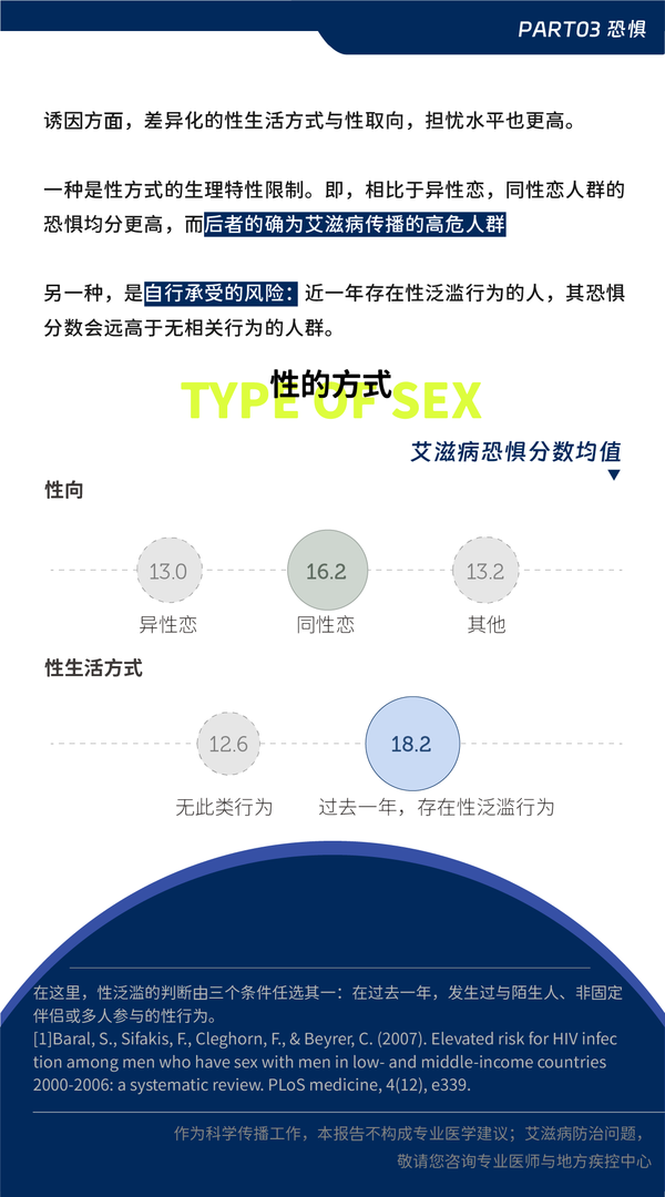 在诱因方面,差异化的性生活方式与性取向,也会带来更高的担忧水平。一种是身不由己,性方式的生理特性限制。即,相比于异性恋(均值13.0分),同性恋人群的恐惧均分为16.2分,而后者的确为艾滋病传播的高危人群[8]。另一种,是自行承受的风险:近一年存在性泛滥行为的人(例如,约炮),其恐惧分数(均值18.2分)会远高于无相关行为的人群(均值12.6分)。