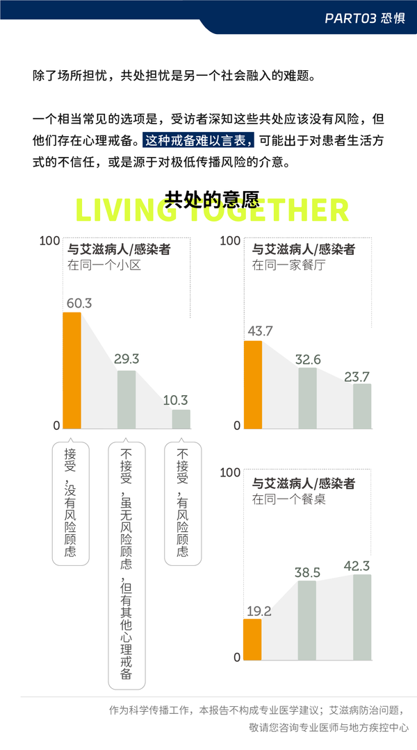 除了场所担忧,共处担忧是另一个社会融入的难题。当受访者被询问是否介意与艾滋病人在同一个小区时,六成人表示接受。当问题变为在同一个餐厅吃饭,乃至在同一个餐桌上吃饭时,接受人群降至四成(43.7%)与两成(19.2%)。