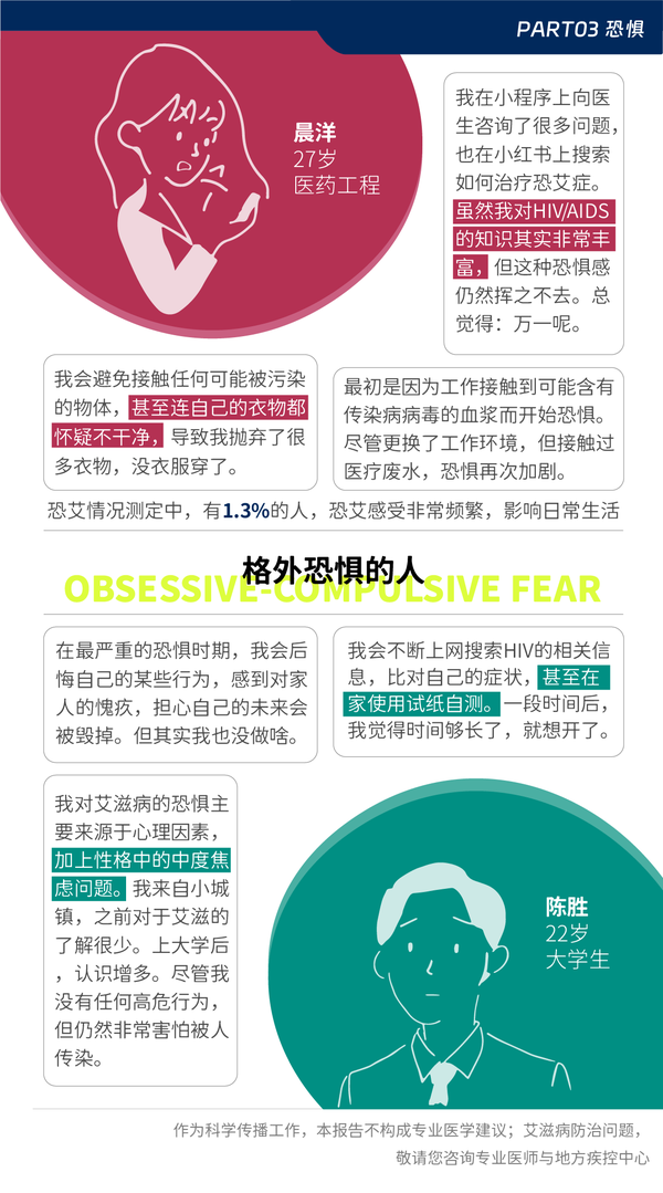 27岁的女孩晨洋属于明确的恐艾症患者。她曾从事体外诊断、凝血分析的工作,在一次血浆检测中发现过传染病病毒,对于传染的恐惧就挥之不去。