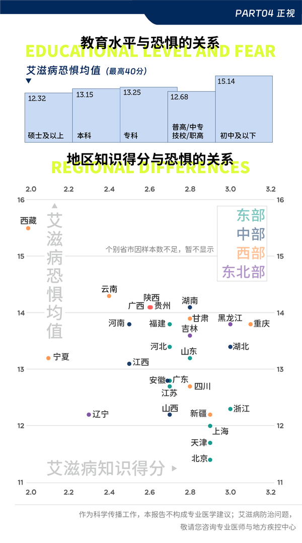 对艾滋病防治知识的掌握依然重要。调研显示,艾滋病知识正确率越高的人,其疾病恐惧值相应变低。而教育显然是促进知识的重要方式。我们发现,相比于初中学历的受访者,硕士学历人士的问答正确率明显更高。
