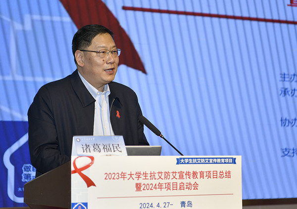 4月27日,2023年大学生抗艾防艾宣传教育项目总结暨2024年项目启动会在我校举办。中国性病艾滋病防治协会会长郝阳、中国疾控中心艾防中心副主任吕繁、山东科技大学副校长诸葛福民等出席会议,启动2024年大学生抗艾防艾宣传教育项目并为我校学生志愿者颁发学生艾滋病防治宣传志愿者聘书。中国性病艾滋病防治协会副会长兼秘书长王新伦主持会议。