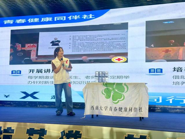 在路演现场,学生们分别带来了项目路演。比如重庆商务职业学院大学生心理健康协会“青年同心 抗艾同行”项目开展了防艾健康教育主题打卡、艾心趣味马拉松、防艾舞台情景剧等。有的社团还通过舞蹈、朗诵等形式,介绍相关情况。
