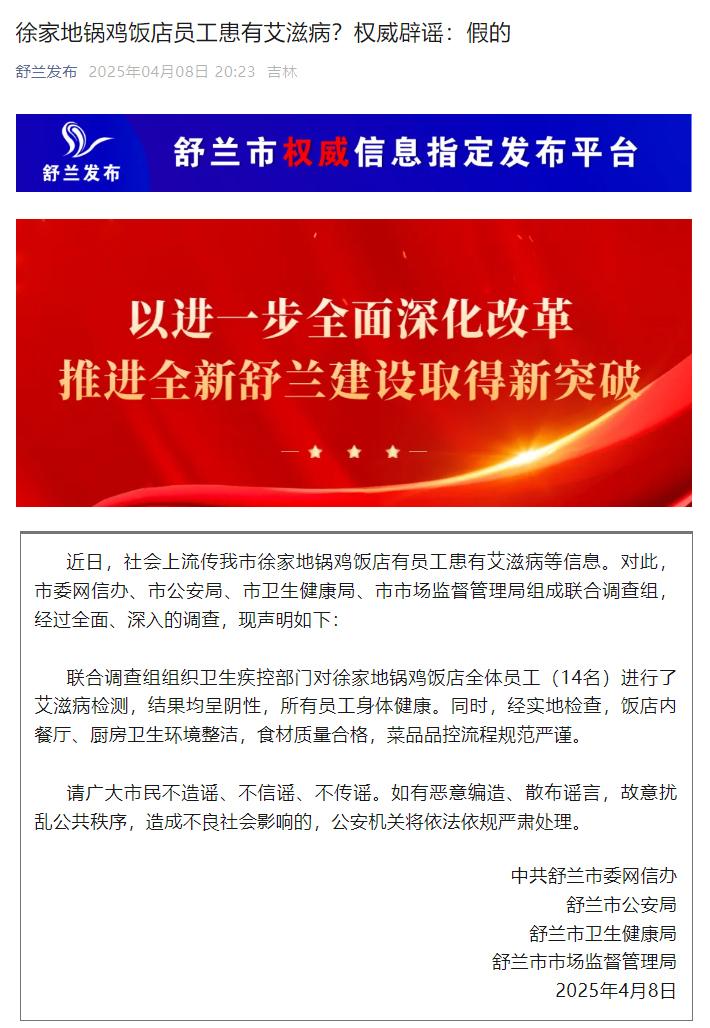据舒兰发布微信公众号消息,中共舒兰市委网信办、舒兰市公安局、舒兰市卫生健康局、舒兰市市场监督管理局4月8日联合通报,近日,社会上流传舒兰市徐家地锅鸡饭店有员工患有艾滋病等信息。对此,市委网信办、市公安局、市卫生健康局、市市场监督管理局组成联合调查组,经过全面、深入的调查,现声明如下: