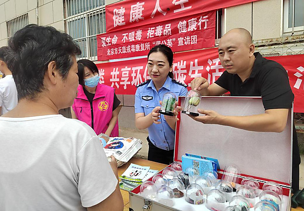 本次宣传活动以“贴近村民、通俗易懂”为原则,通过多种形式普及禁毒知识,通过悬挂宣传横幅,营造了浓厚的禁毒氛围。在宣传区域悬挂“健康人生,绿色无毒”等禁毒主题横幅,直观传递禁毒核心理念,让村民在日常通行中就能感受到禁毒宣传氛围。现场工作人员向村民发放禁毒宣传手册,手册内容涵盖常见毒品类型、危害、识别方法及禁毒法律法规,帮助村民快速掌握基础禁毒知识,便于后续自主学习和向家人普及。此外,北京市天康戒毒康复所的范硕范警官及工作人员结合毒品仿真样品与案例开展现场讲解。讲解中,宣传员不仅详细介绍了传统毒品的危害,还展示了仿真毒品样本(如罂粟、大麻、跳跳糖等)。通过“看样本、讲危害”的方式,让村民直观识别毒品,避免误触。同时,针对村民提出的“如何防范毒品诱惑”“发现涉毒行为该怎么办”等问题,宣传员逐一解答,进一步强化村民的自我保护意识和禁毒参与意识。